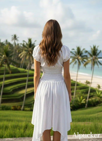 Elevate your style with our Dress with Sleeves and Handkerchief Hem. This versatile dress features short puff sleeves, a drawstring front, and a flattering v-neck. The stretchy elastic waistline ensures a comfortable fit for sizes 8 to 12. The beautiful handkerchief hem adds a touch of elegance to any look. Upgrade your wardrobe with this must-have dress!